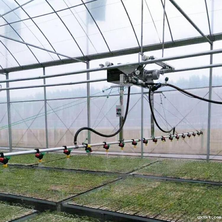 喷灌机,利用微电脑和磁性号进行控制,并加以遥控装置,自动化程度很高,悬挂在温室上部的双 轨道管上,能够根据用户的选择实现:正向运行、反向运行、连续喷灌,及相应的正向喷淋、反向喷淋以及往返喷淋。喷灌机为双臂喷灌管,每个喷头有三种不同流量和雾化程度的喷嘴,轻轻转动该喷头就可选择合适的喷嘴。